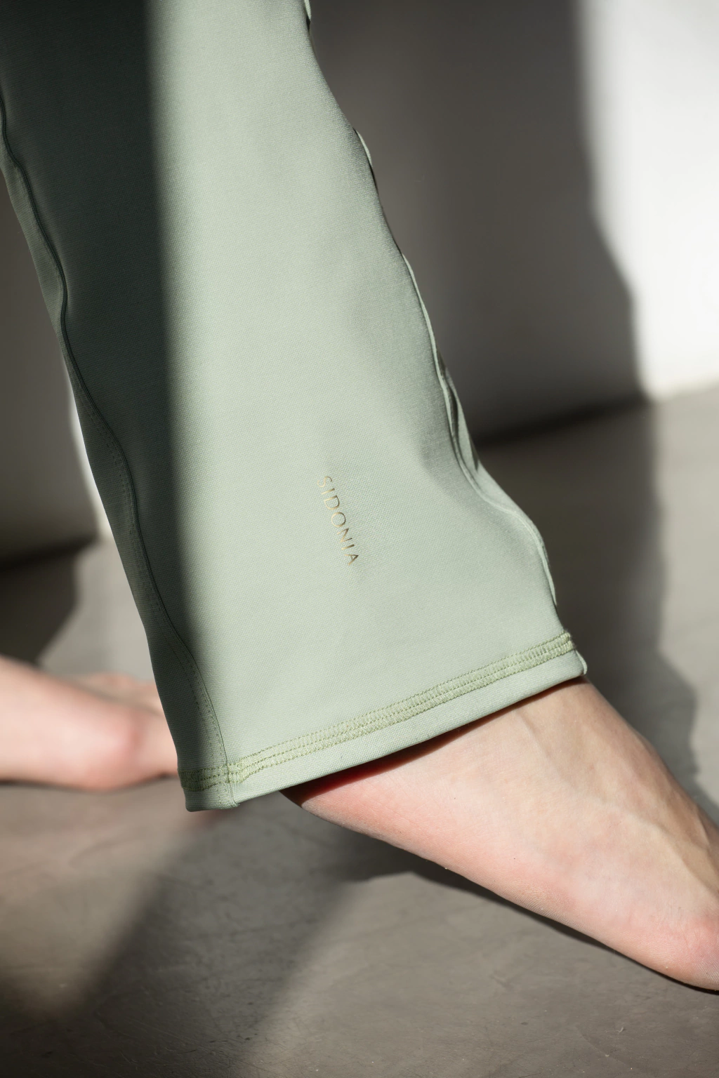Calza larga recta confeccionada en polisap mate. Presenta recortes verticales en delantero y trasero que estilizan la figura. Cintura ancha y extra alta con elástico interno para un ajuste seguro y confortable. Detalle de logo estampado y grifa cosida.