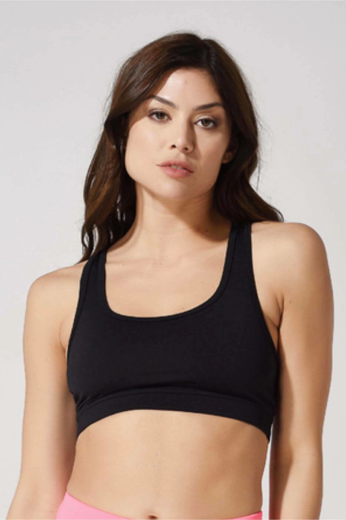 Top confeccionado en polisap, con espalda deportiva, breteles anchos que aportan comodidad y soporte. Escote y sisas con collareta fina de la misma tela. Bajo busto con cintura postiza y elástico ancho interno para un ajuste seguro. Está totalmente forrado en microfibra liviana. Incluye ojales para incorporar rellenos desmontables. Detalle de grifa cosida.